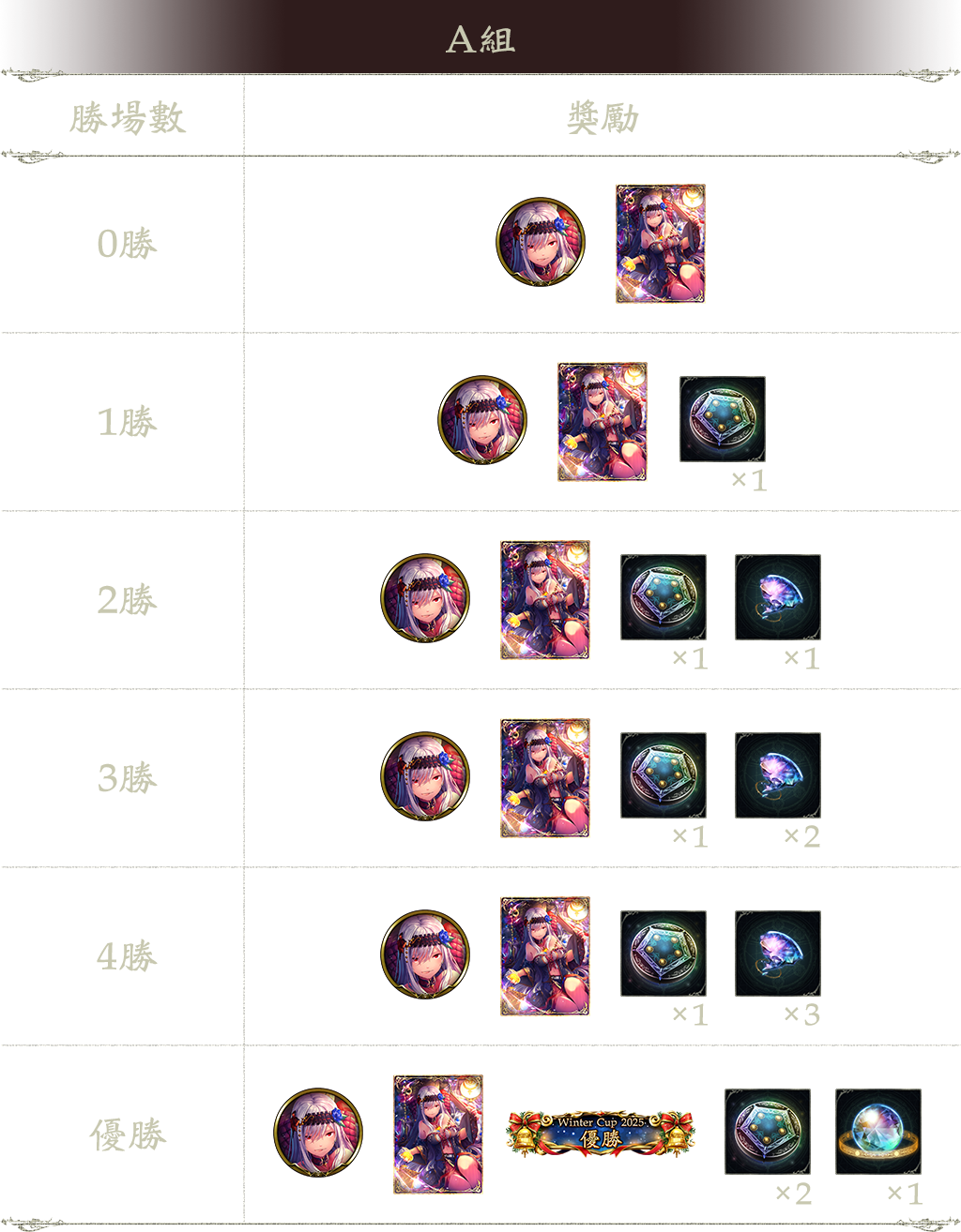 5勝:溯時指定系列卡包兌換券 3張、次元石 1個、Winter Cup 2025 優勝(稱號)