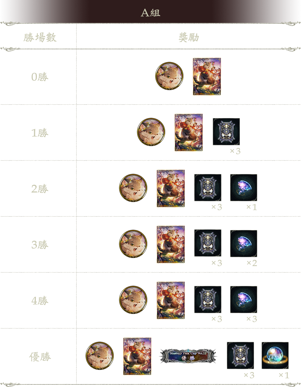 5勝:溯時指定系列卡包兌換券 3張、次元石 1個、Strategy Pick Cup Vol.12 優勝(稱號)