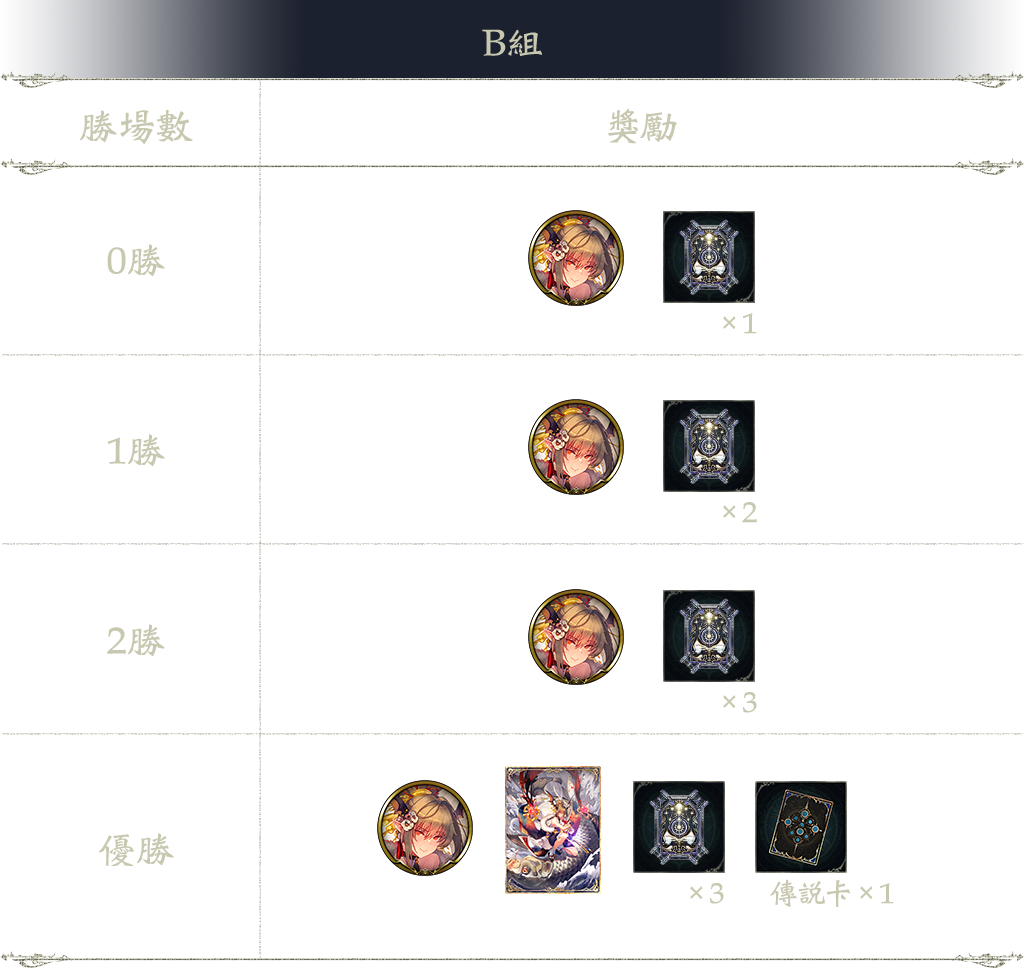 3勝:溯時指定系列卡包兌換券 3張、傳說卡 1張(隨機)、血豔領主‧夕月(進化後)(卡背)