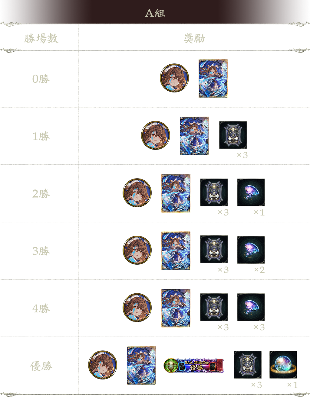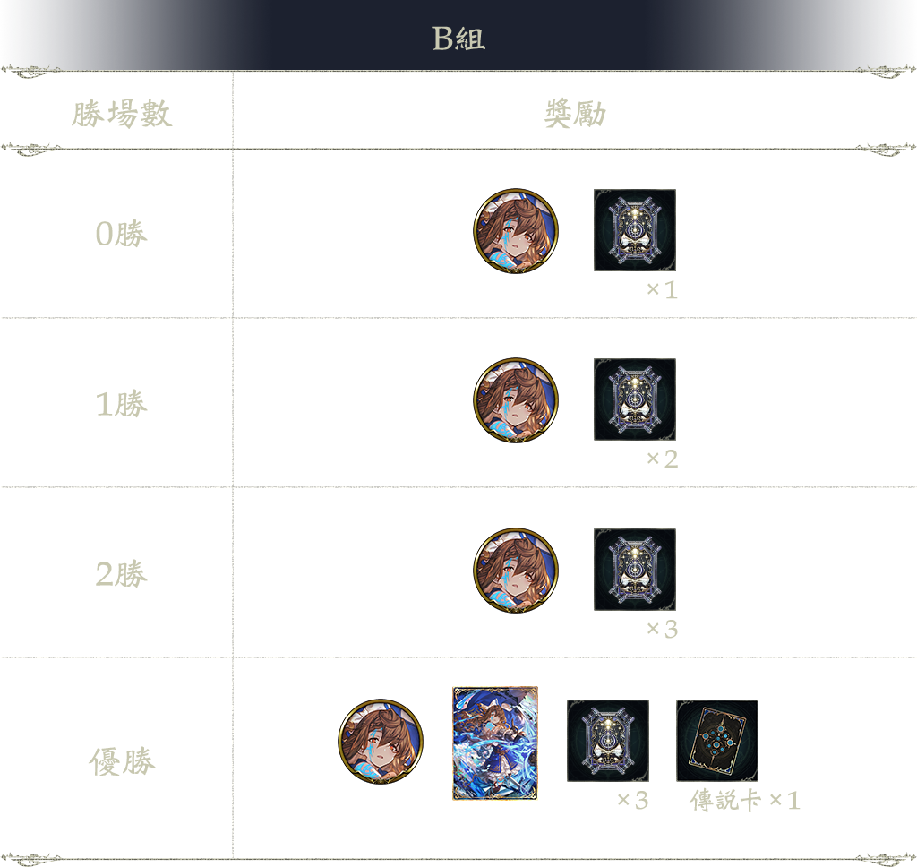 每進行1次挑戰,皆可依勝場數獲得下列道具作為獎勵: