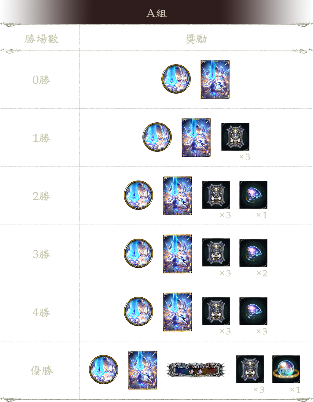 5勝:溯時指定系列卡包兌換券 3張、次元石 1個、Strategy Pick Cup Vol.13 優勝(稱號)