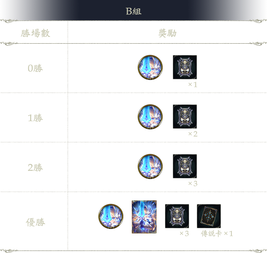 3勝:溯時指定系列卡包兌換券 3張、傳說卡 1張(隨機)、聖女的號令(卡背)