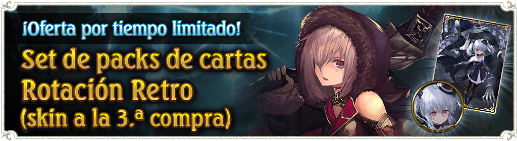 Del 1 de noviembre a las 3:00 al 8 de noviembre a las 15:59 (GMT+1) podrás adquirir hasta 3 veces un set especial de 10 packs de cartas Rotación Retro. En los dos primeros sets que adquieras, la última carta del décimo pack será una carta legendaria o con skin incluido. Esta carta es elegida al azar de entre los packs de Rotación Retro. En el tercer set que adquieras, la última carta del décimo pack será una carta con skin incluido. Esta carta es elegida al azar, pero puedes elegir excluir las cartas con skin que ya tienes para que no salga la misma. Además, regalaremos los siguientes artículos dependiendo del número de sets adquiridos: