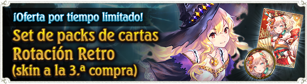 Del 1 de enero a las 3:00 al 8 de enero a las 15:59 (GMT+1) podrás adquirir hasta 3 veces un set especial de 10 packs de cartas Rotación Retro. En los dos primeros sets que adquieras, la última carta del décimo pack será una carta legendaria o con skin incluido. Esta carta es elegida al azar de entre los packs de Rotación Retro. En el tercer set que adquieras, la última carta del décimo pack será una carta con skin incluido. Esta carta es elegida al azar, pero puedes elegir excluir las cartas con skin que ya tienes para que no salga la misma. Además, regalaremos los siguientes artículos dependiendo del número de sets adquiridos:
