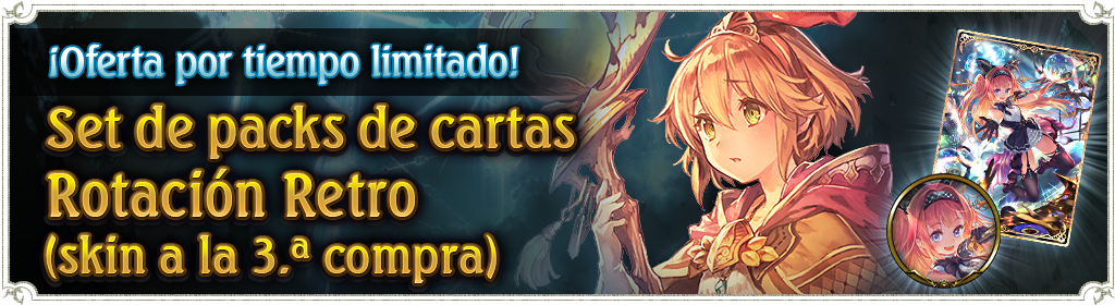 Del 1 de marzo a las 3:00 al 8 de marzo a las 15:59 (GMT+1) podrás adquirir hasta 3 veces un set especial de 10 packs de cartas Rotación Retro. En los dos primeros sets que adquieras, la última carta del décimo pack será una carta legendaria o con skin incluido. Esta carta es elegida al azar de entre los packs de Rotación Retro. En el tercer set que adquieras, la última carta del décimo pack será una carta con skin incluido. Esta carta es elegida al azar, pero puedes elegir excluir las cartas con skin que ya tienes para que no salga la misma. Además, regalaremos los siguientes artículos dependiendo del número de sets adquiridos: