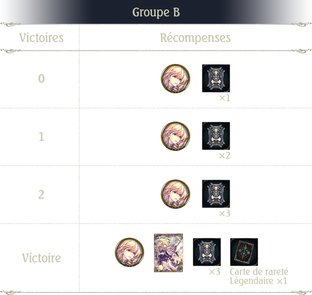 Notez que les récompenses du Groupe A au 2e tour sont plus prestigieuses que celles du Groupe B. Remporter plus d'une victoire permet d'obtenir une récompense de valeur égale ou supérieure à 1 ticket card pack.
