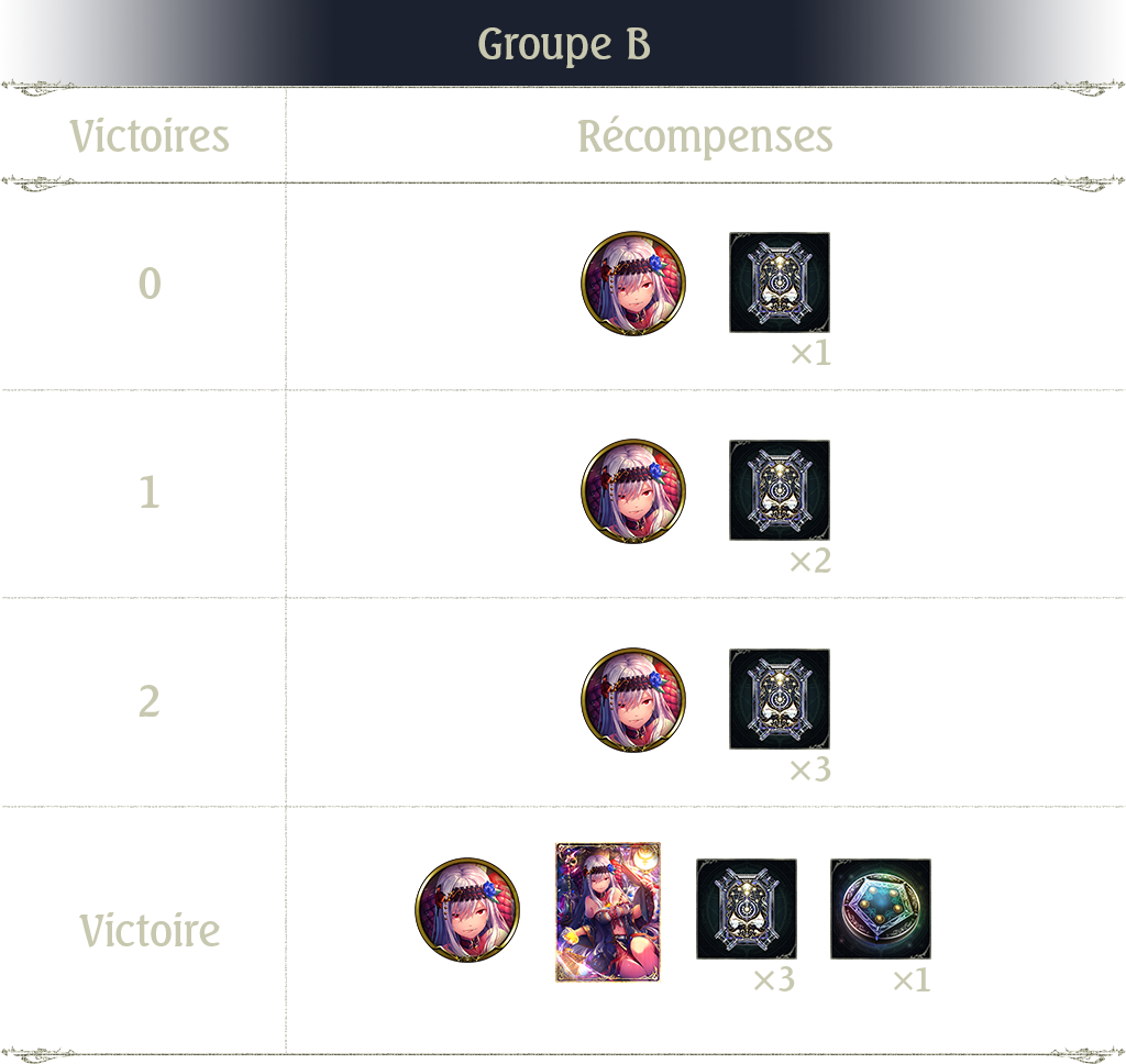 Notez que les récompenses du Groupe A au 2e tour sont plus prestigieuses que celles du Groupe B. Remporter plus d'une victoire permet d'obtenir une récompense de valeur égale ou supérieure à 1 ticket card pack.