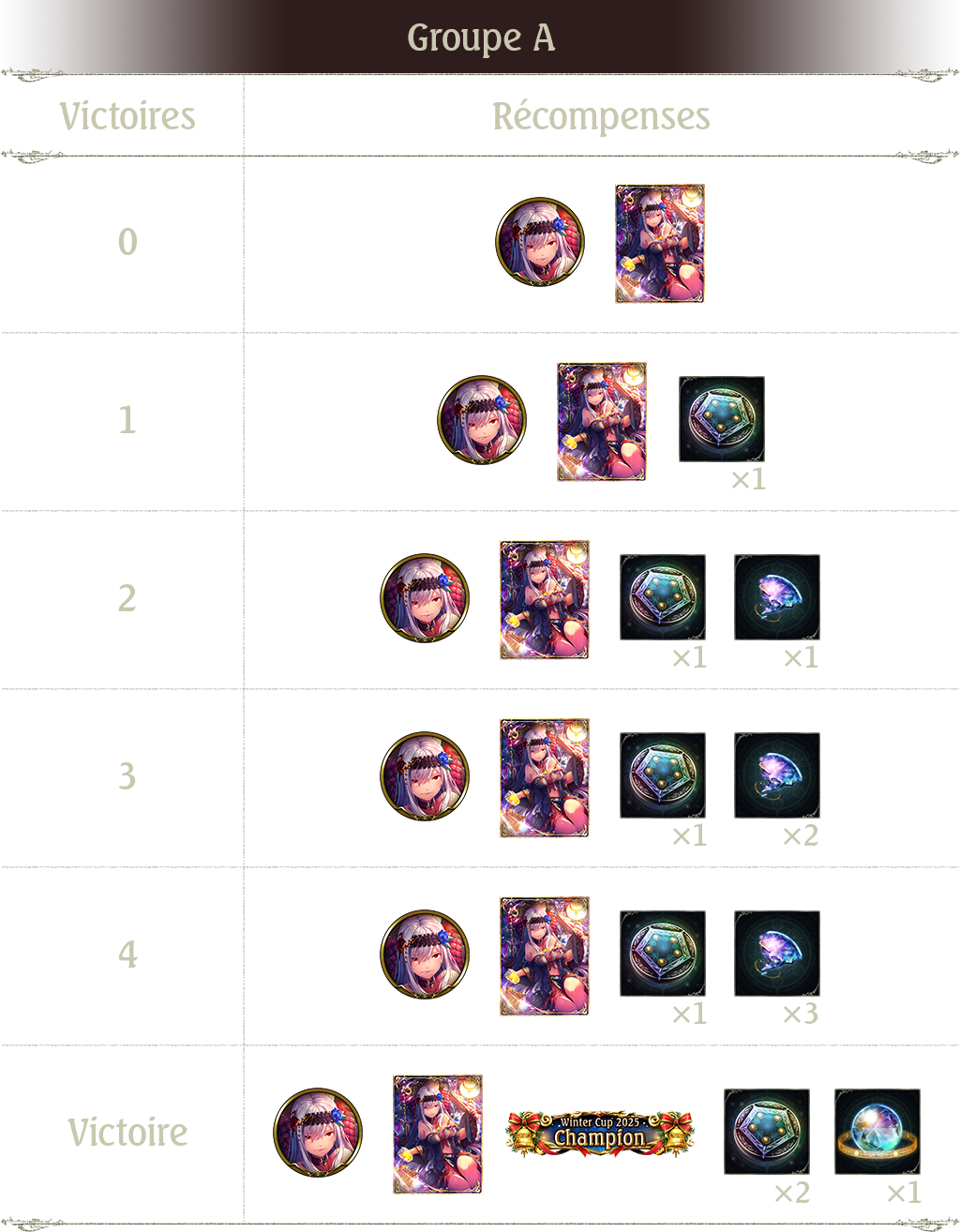5 victoires : Ticket Rétro Alterné card pack x 3, sphère x 1 et tag Winter Cup 2025 Champion