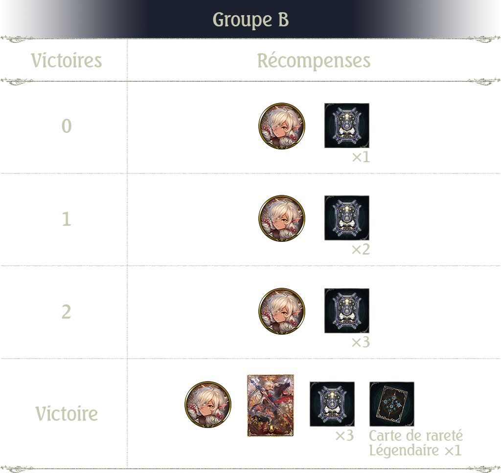 Notez que les récompenses du Groupe A au 2e tour sont plus prestigieuses que celles du Groupe B. Remporter plus d'une victoire permet d'obtenir une récompense de valeur égale ou supérieure à 1 ticket card pack.