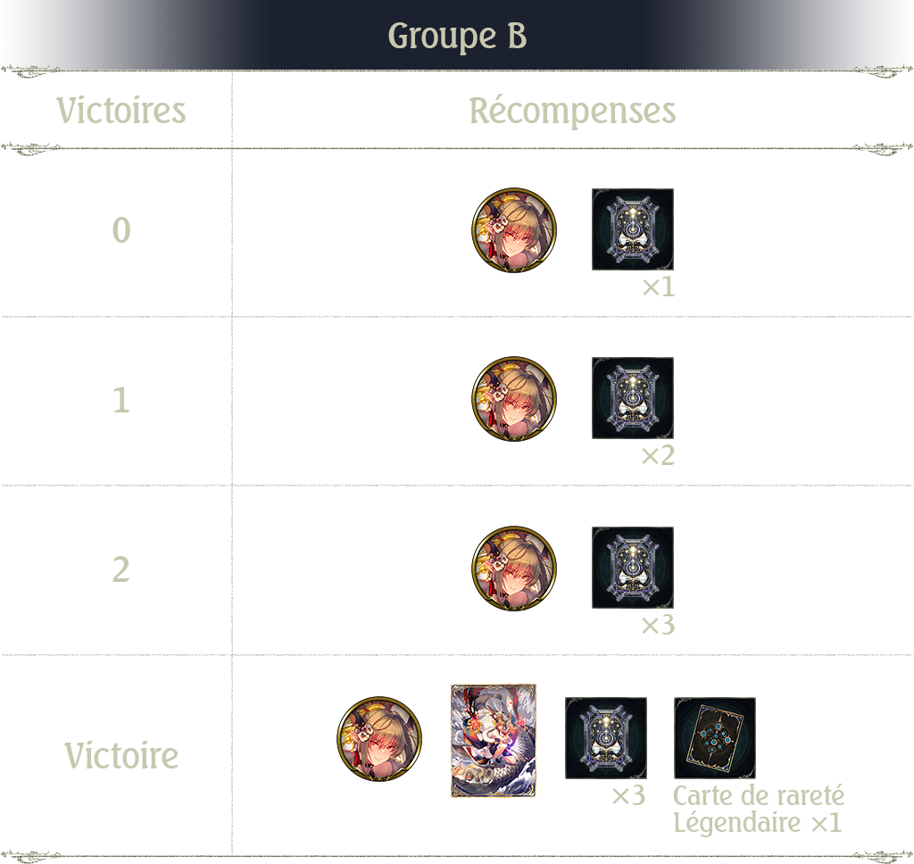 Notez que les récompenses du Groupe A au 2e tour sont plus prestigieuses que celles du Groupe B. Remporter plus d'une victoire permet d'obtenir une récompense de valeur égale ou supérieure à 1 ticket card pack.