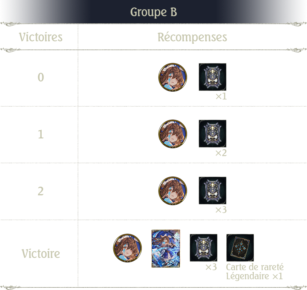 Notez que les récompenses du Groupe A au 2e tour sont plus prestigieuses que celles du Groupe B. Remporter plus d'une victoire permet d'obtenir une récompense de valeur égale ou supérieure à 1 ticket card pack.