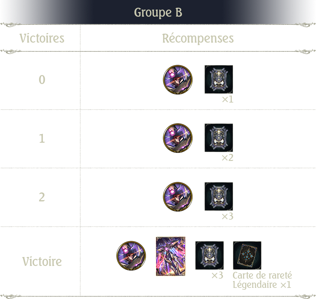 Notez que les récompenses du Groupe A au 2e tour sont plus prestigieuses que celles du Groupe B. Remporter plus d'une victoire permet d'obtenir une récompense de valeur égale ou supérieure à 1 ticket card pack.