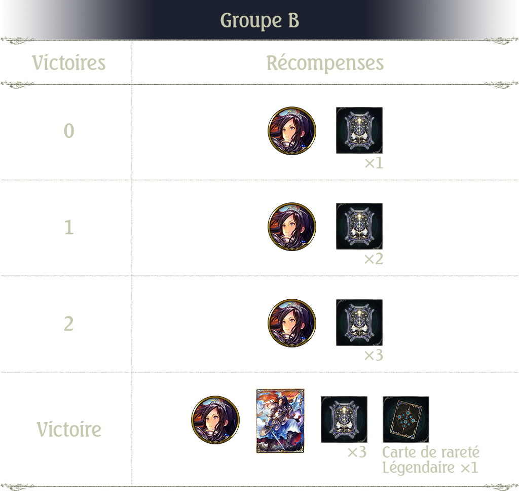 Notez que les récompenses du Groupe A au 2e tour sont plus prestigieuses que celles du Groupe B. Remporter plus d'une victoire permet d'obtenir une récompense de valeur égale ou supérieure à 1 ticket card pack.