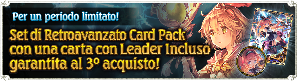 A partire dalle 3:00 (GMT+1) del 1º marzo e fino alle 15:59 (GMT+1) dell’8 marzo, nel Negozio sarà in vendita un Set di 10 Retroavanzato Card Pack, disponibile per un massimo di 3 volte. L'ultima carta del decimo pacchetto del primo e del secondo set acquistato sarà una carta con Leader Incluso o una Leggendaria appartenenti al formato Retroavanzato attuale! L'ultima carta del decimo pacchetto del terzo set acquistato sarà sicuramente una carta con Leader Incluso.