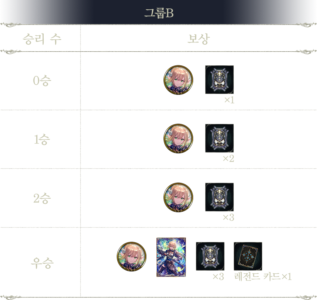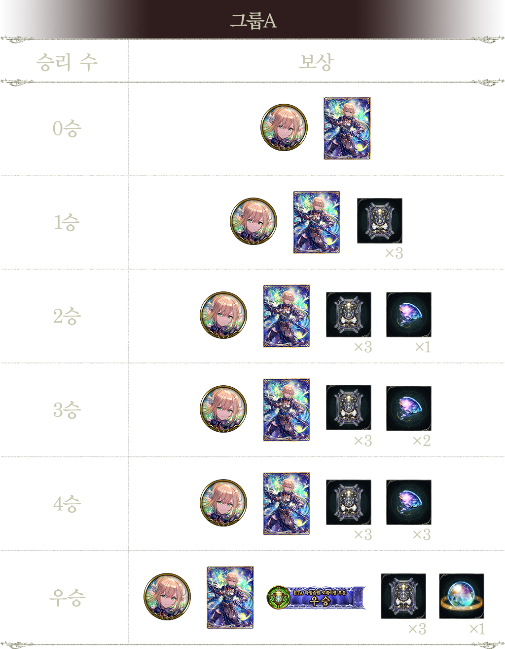 - 4승 : 여왕의 기사 신시아(엠블럼), 여왕의 기사 신시아(카드뒷면), 타임슬립 로테이션 카드팩 티켓 3장, 오브 조각 3개