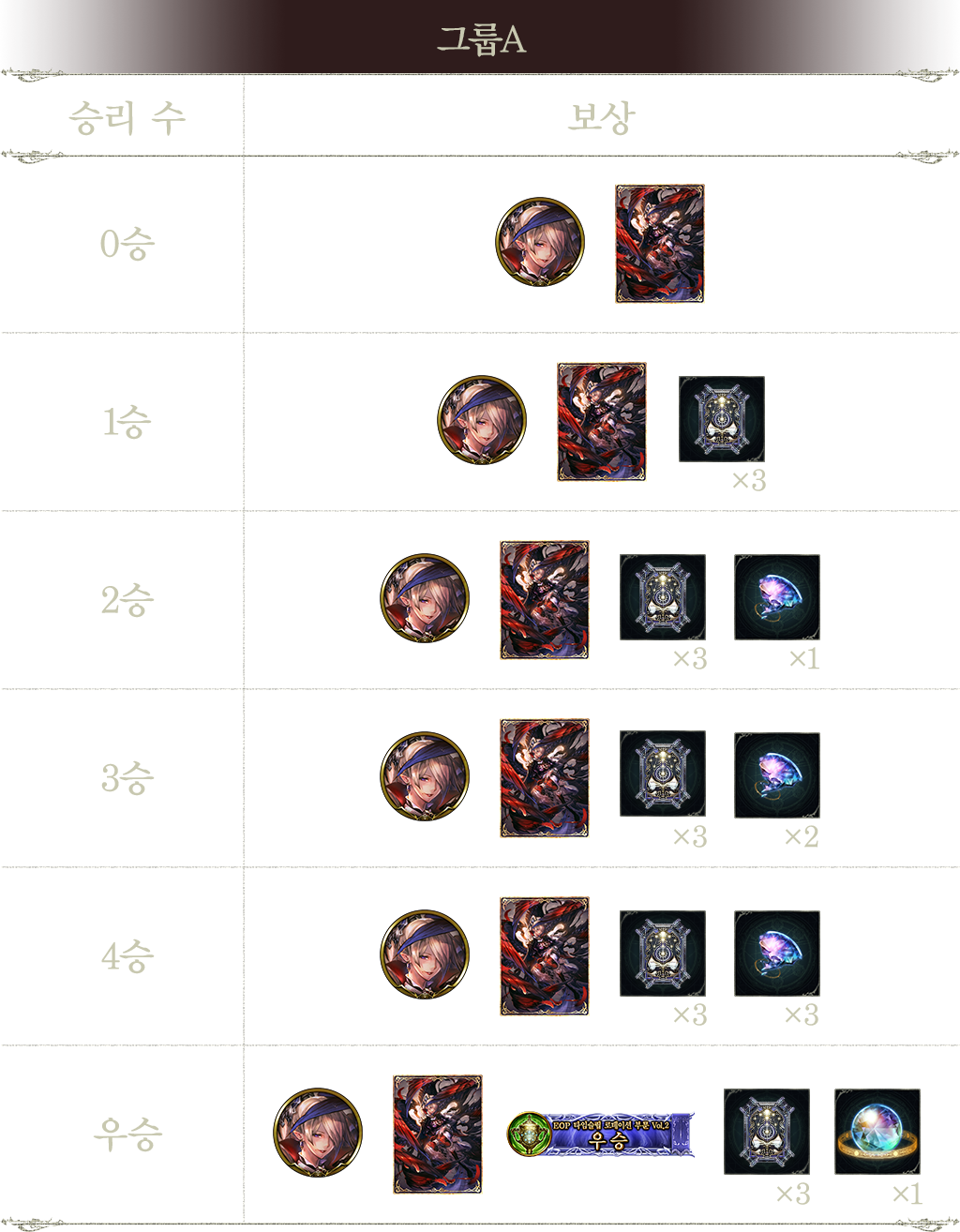 - 2승 : 정념의 재앙 바나레이크(엠블럼), 정념의 재앙 바나레이크(카드뒷면), 타임슬립 로테이션 카드팩 티켓 3장, 오브 조각 1개