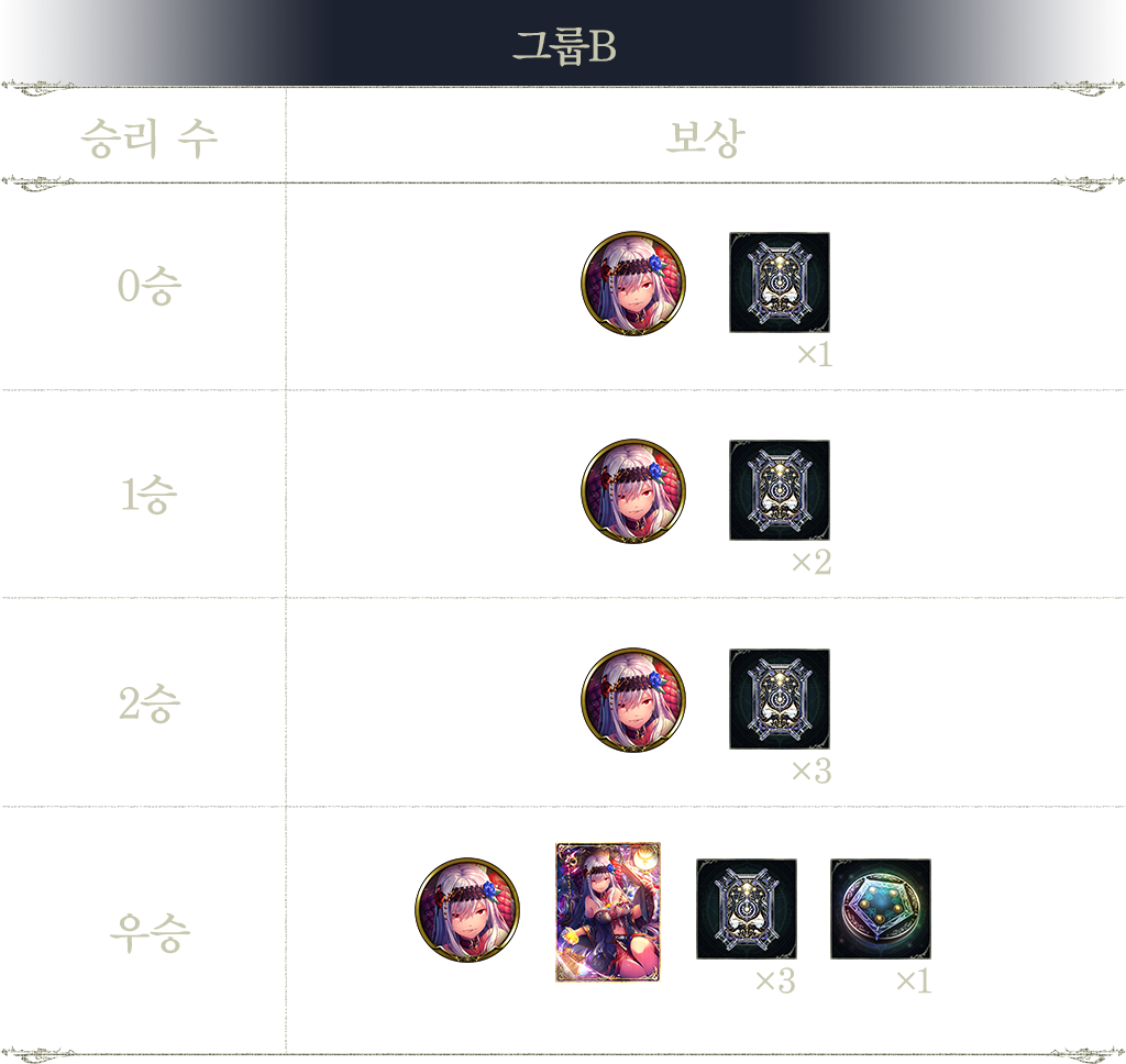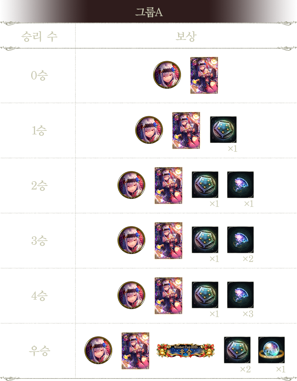 - 4승 : 영겁을 바라는 자 케리드웬(엠블럼), 영겁을 바라는 자 케리드웬(카드뒷면), 타임슬립 로테이션 카드팩 티켓 3장, 오브 조각 3개