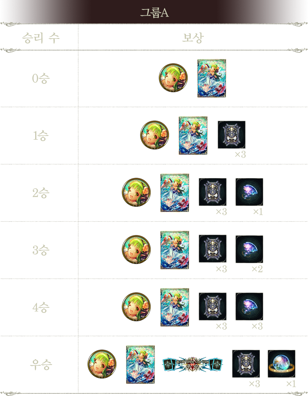 - 2승 : 낙원요정 아이리스(엠블럼), 타임슬립 로테이션 카드팩 티켓 3장