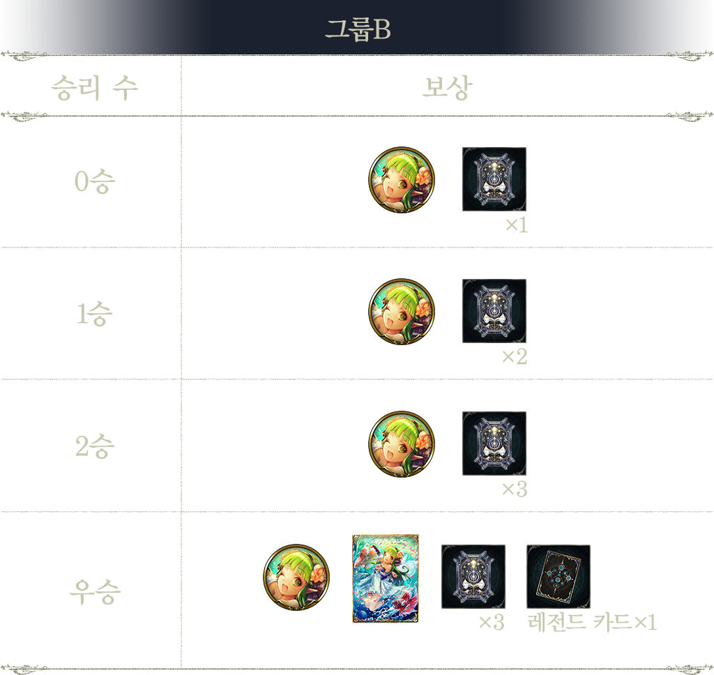 - 3승 : 낙원요정 아이리스(엠블럼), 낙원요정 아이리스(카드뒷면), 타임슬립 로테이션 카드팩 티켓 3장, 오브 조각 2개